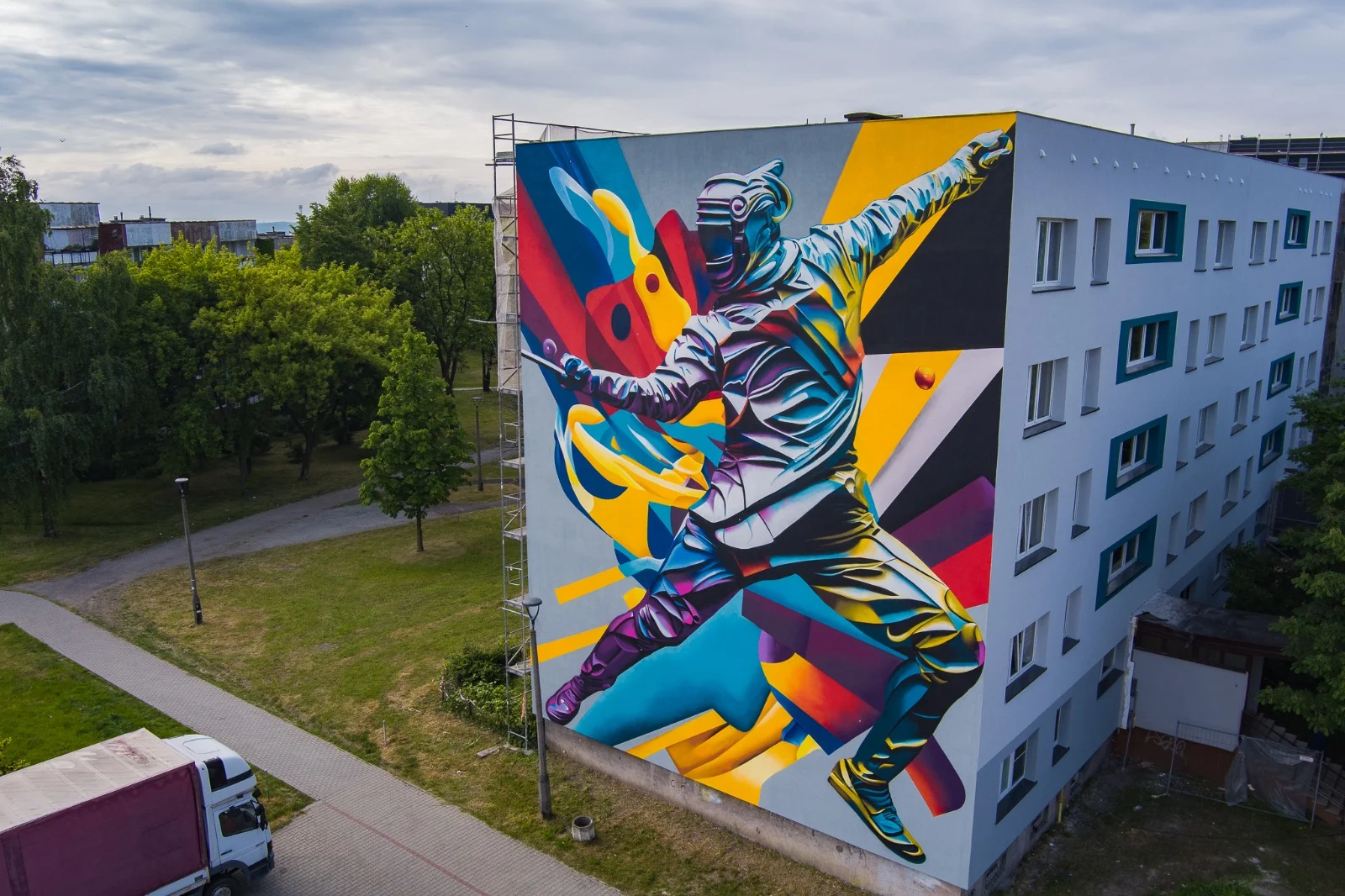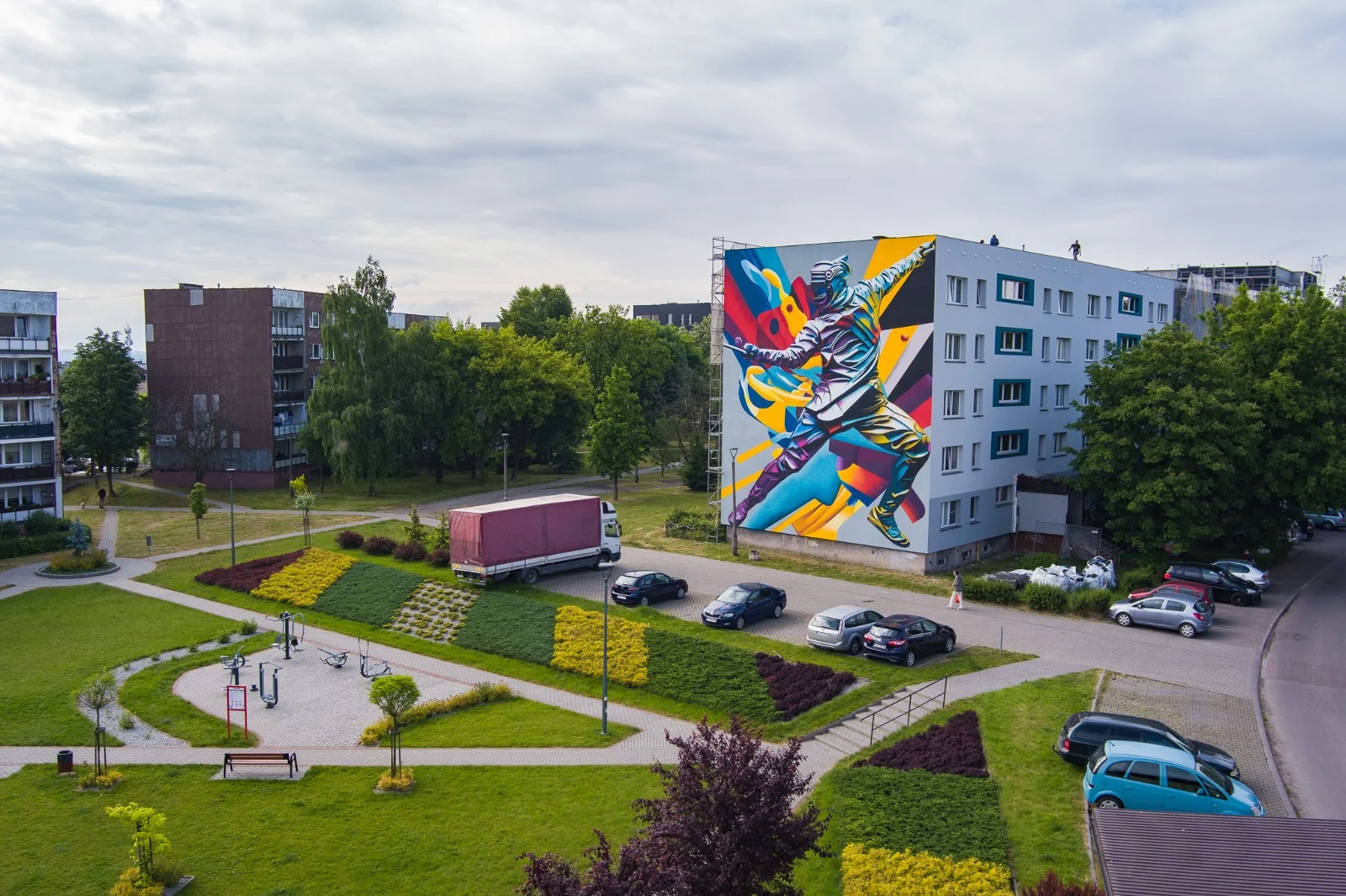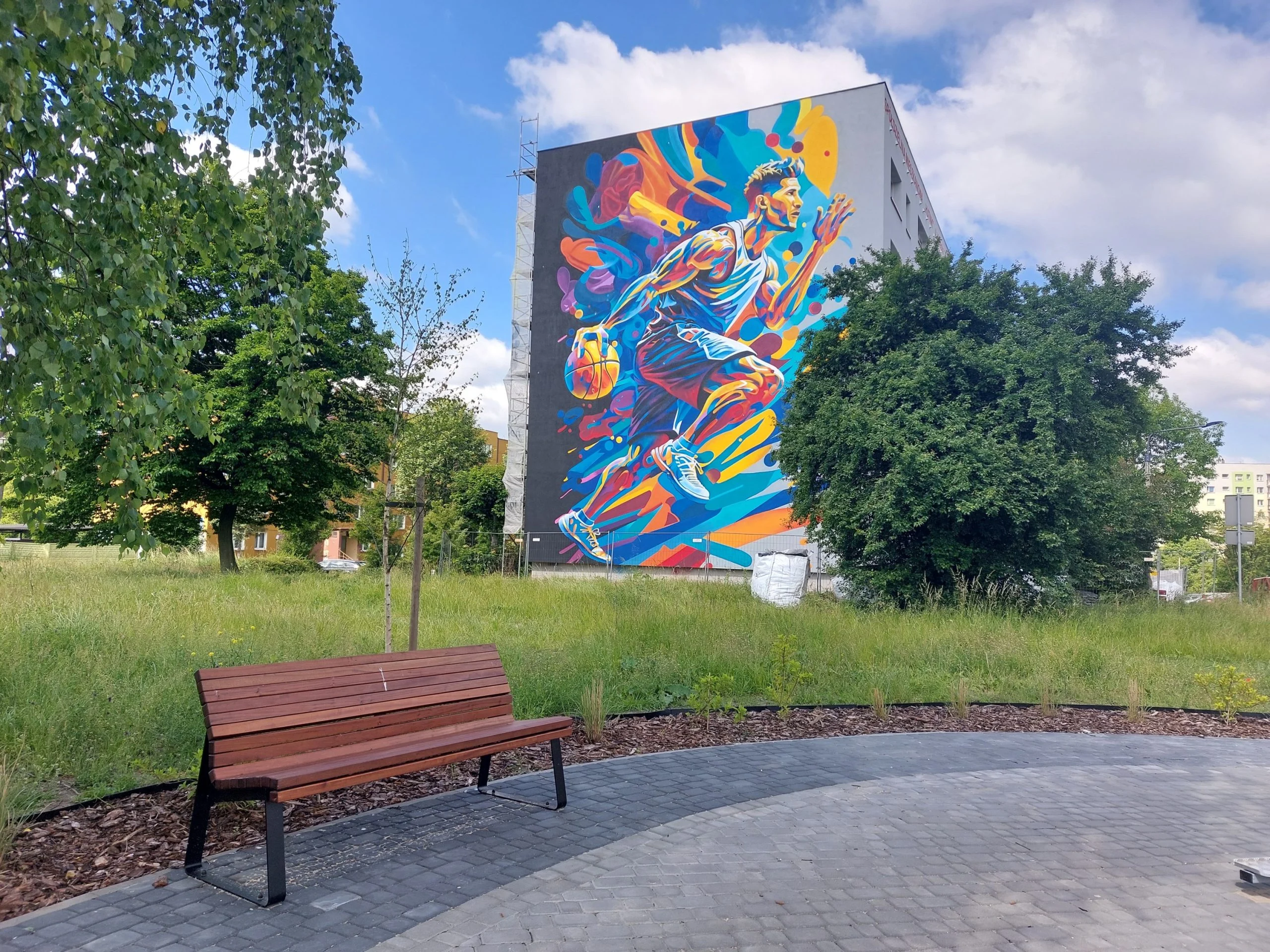 Jaskrawy, żółto-czerwono-niebieski mural szermierza w bojowej pozycji pojawił się niedawno na ścianie jednego z budynków przy ul. Koszalińskiej w Sosnowcu, a przy ul. Kieleckiej 20 fasadę bloku zdobi obraz wielkiego koszykarza.