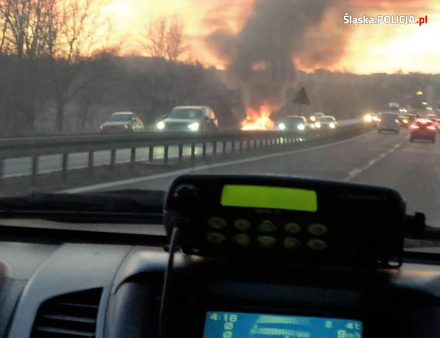 Policjanci z katowickiego Oddziału Prewencji pełnili tego dnia służbę na lotnisku w Pyrzowicach. Kiedy wracali już do domu, zauważyli, że na poboczu przeciwległego pasa ruchu pali się samochód osobowy, a stojący przy nim mężczyzna w pośpiechu próbował ocalić znajdujące się w bagażniku rzeczy przed spaleniem. Płomienie ciągle się powiększały, a ogień zaczął również zajmować tył pojazdu. Widząc, że za chwilę może dojść do tragedii, mundurowi dosłownie w ostatniej chwili odciągnęli kierowcę od pojazdu – moment później eksplodowało paliwo oraz akumulator, a cały pojazd zamienił się w kulę ognia. Dzięki szybkiej interwencji na szczęście nikomu nic się nie stało.