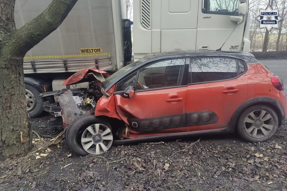 Wczoraj, około godziny 13:45, doszło do groźnego wypadku na ulicy Brzezińskiej w Mysłowicach. 18-letni kierowca Citroena, jadąc w stronę Kosztów, najprawdopodobniej w wyniku zasłabnięcia zjechał na przeciwległy pas ruchu. Tam zderzył się z ciężarówką, a następnie uderzył w drzewo.