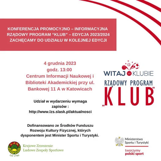 Konferencja promocyjno-informacyjna dotycząca realizacji zadania publicznego w ramach Rządowego Programu "Klub" edycja 2023/2024 odbędzie się 4 grudnia 2023 roku o godzinie 13:00 w Centrum Informacji Naukowej i Bibliotece Akademickiej przy ul. Bankowej 11 A w Katowicach.