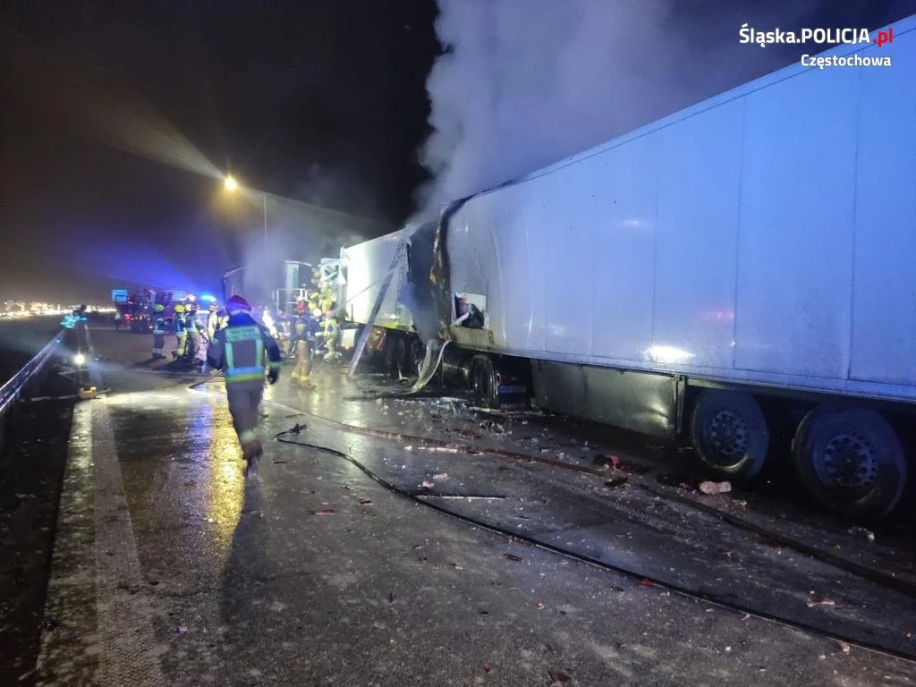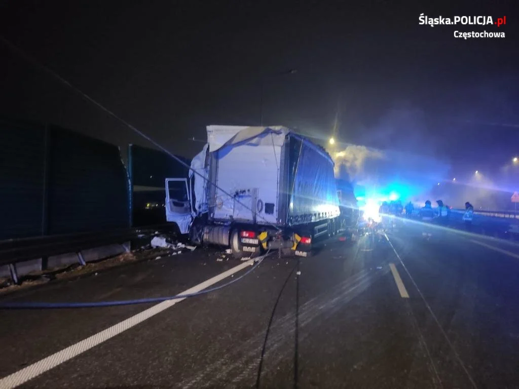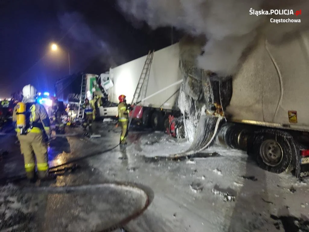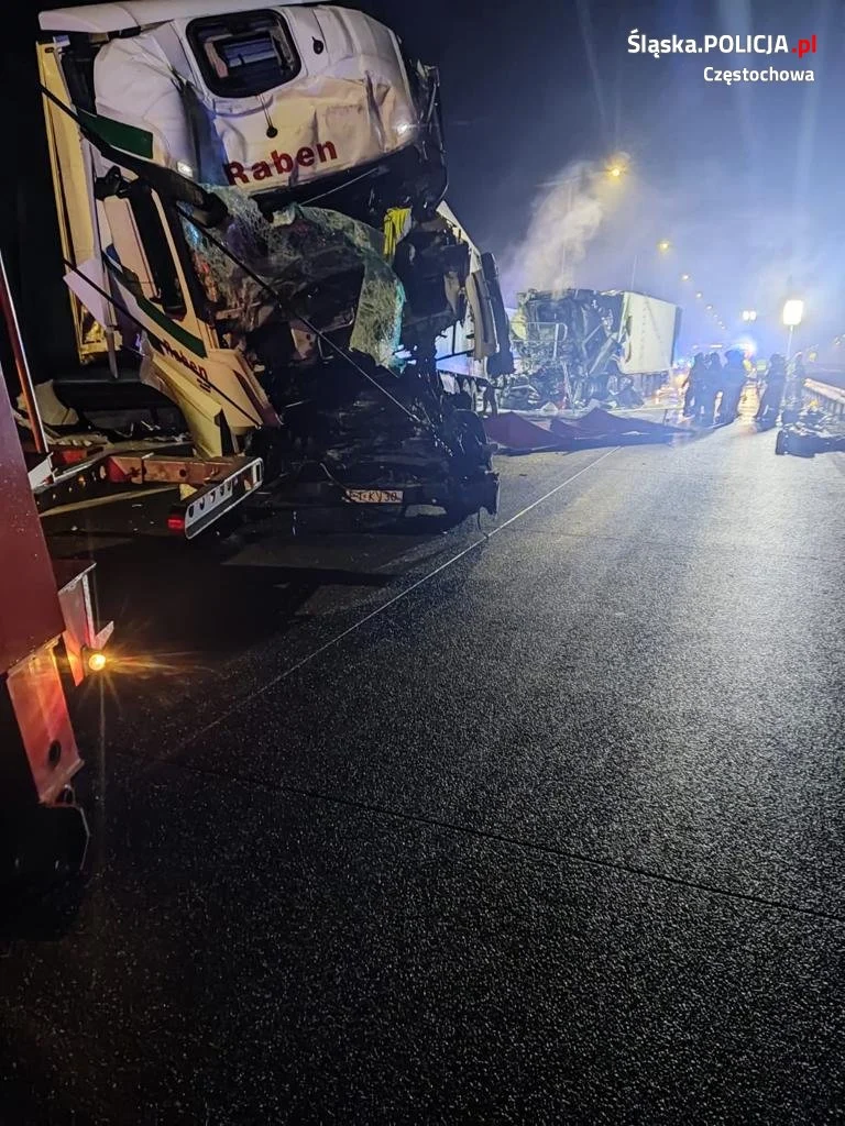 Wstępne ustalenia wskazują, że kierujący zestawem pojazdów marki Scania najechał na tył stojącego na prawym pasie ruchu w zatorze drogowym inny zestaw pojazdów. Samochody stanęły w ogniu. Siła uderzenia była tak duża, że kolejne 3 poprzedzające zestawy pojazdów uległy uszkodzeniu. Niestety w wyniku tego zdarzenia 41-letni kierujący scanią poniósł śmierć na miejscu. 66-letni kierujący ciągnikiem marki Mercedes w ciężkim stanie został przewieziony do szpitala. Droga do wczesnych godzin porannych była zablokowana.