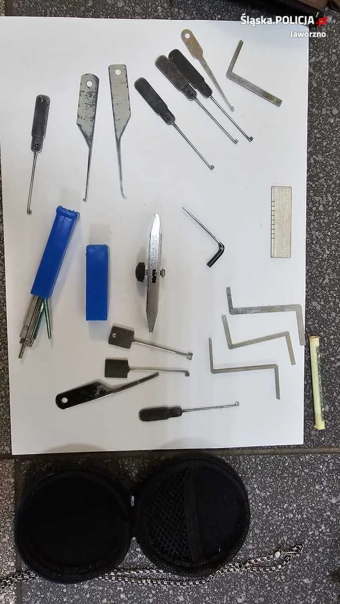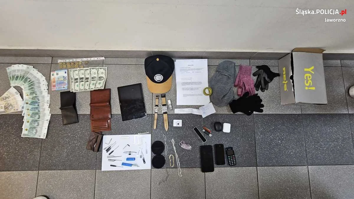 Jaworzniccy policjanci prowadzili wnikliwe ustalenia w sprawie szeregu włamań do mieszkań na terenie Jaworzna. Na podstawie licznych sprawdzeń wytypowali kilka pojazdów, którymi przemieszczali się sprawcy. Gdy jeden z ustalonych pojazdów wjechał na teren Jaworzna, doszło do zatrzymania dwóch podróżujących nim obywateli Gruzji w wieku 32 i 44 lata. Jak ustalili mundurowi, sprawcy poruszali się samochodem, który kupili na podrobiony dowód osobisty pewnego obywatela słowackiego. Pojazd ten wykorzystywali podczas włamań. W trakcie przeszukania kryminalni znaleźli w jednym z mieszkań zajmowanych przez sprawców gotówkę w różnych walutach, biżuterię, dokumenty, telefony komórkowe i sprzęt elektroniczny. Zabezpieczyli również narzędzia, służące podejrzanym do popełnienia przestępstw.