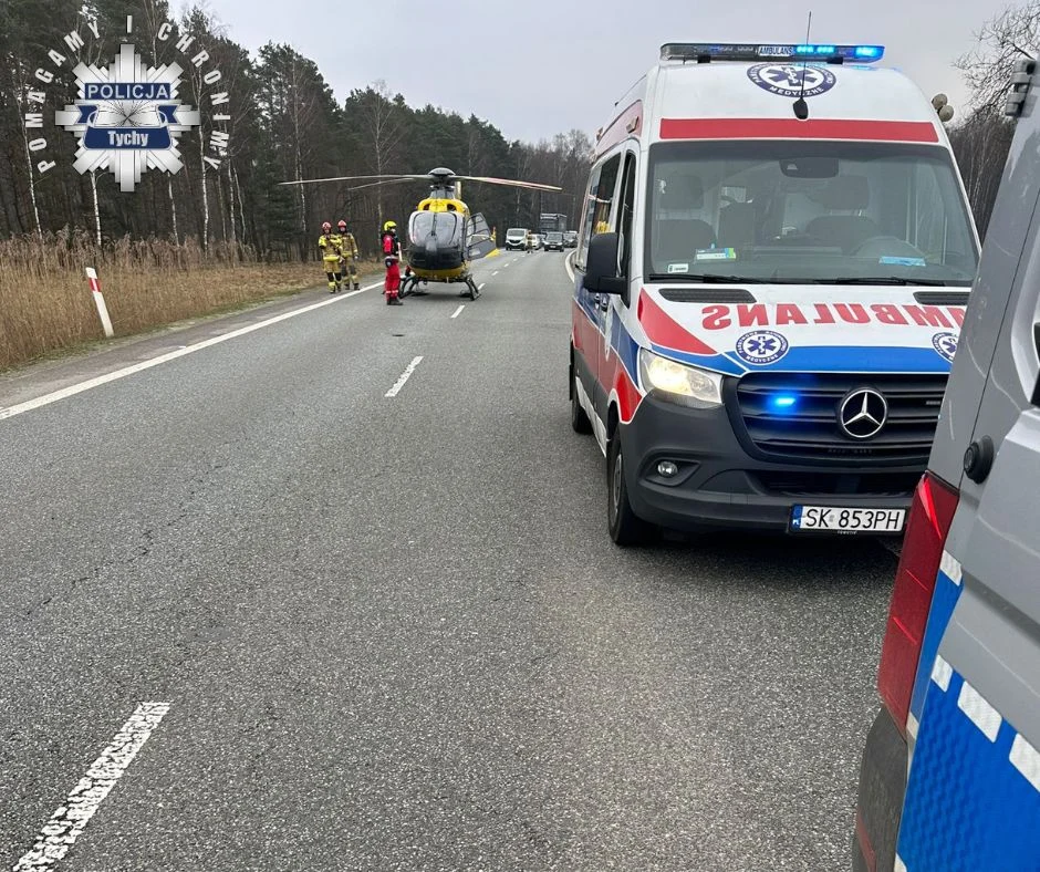 Dyżurny tyskiej jednostki został powiadomiony o zdarzeniu drogowym, do którego doszło wczoraj około godziny 13.00 na trasie DK-86 w Tychach, na pasie w kierunku Pszczyny. Pracujący na miejscu policjanci ruchu drogowego ustalili, że spod kół pojazdu jadącego przed samochodem osobowym marki Mazda, został wyrzucony odłamek asfaltu, który przebił przednią szybę, raniąc kierującego osobówką. Na miejsce zostały zadysponowane służby medyczne, w tym Lotnicze Pogotowie Ratunkowe. Po udzieleniu pomocy 34-letniemu kierującemu został on przetransportowany do szpitala – na szczęście w stanie niezagrażającym życiu i zdrowiu. Pasażerka samochodu osobowego nie odniosła żadnych obrażeń.
