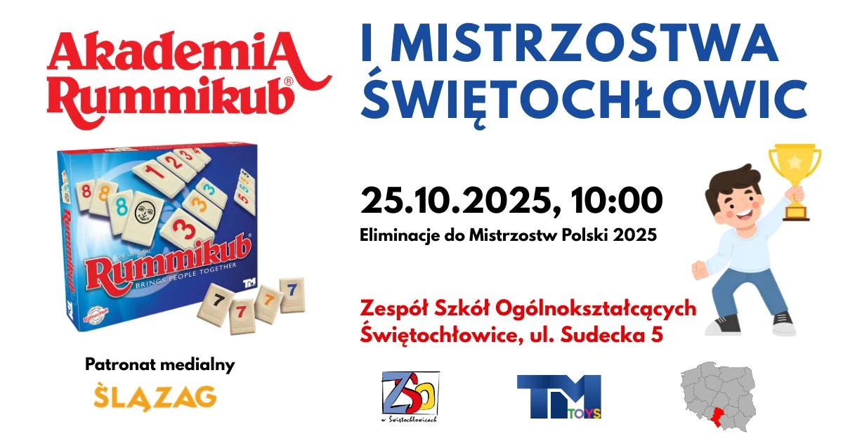 Serdecznie zapraszamy na I Mistrzostwa Świętochłowic w Rummikub, które odbędą się 25 października 2025 w Zespole Szkół Ogólnokształcących w Świętochłowicach.