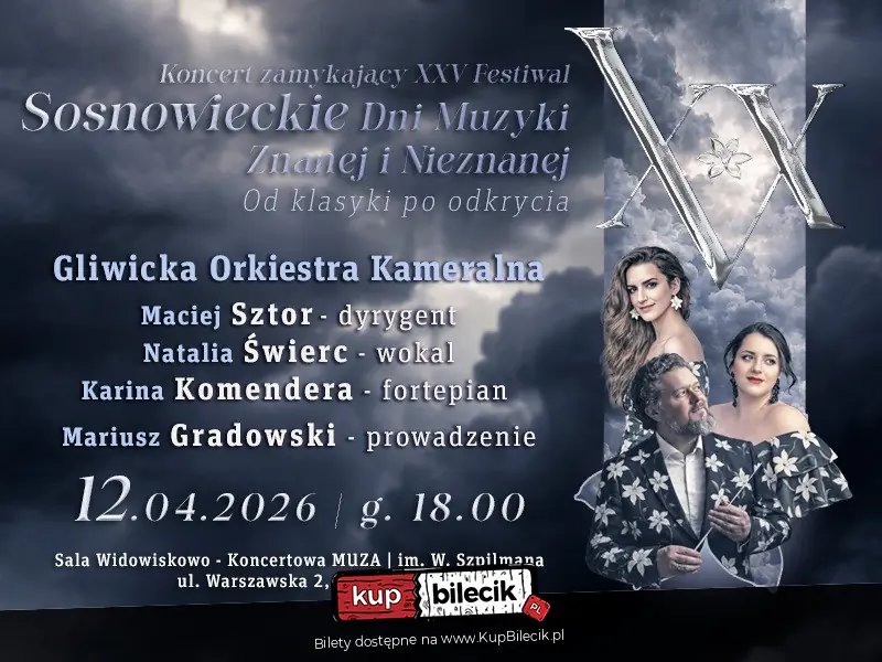 12 kwietnia 2026 roku w Sali Widowiskowo‑Koncertowej MUZA w Sosnowcu odbędzie się koncert zamykający XXV edycję Festiwalu Sosnowieckie Dni Muzyki Znanej i Nieznanej. W programie znalazły się utwory filmowe oraz kompozycje prezentowane pod wspólnym hasłem „Historie walcem pisane”.
