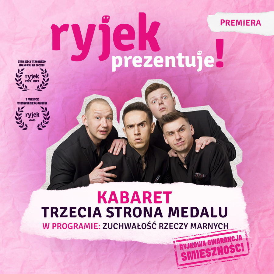 RYJEK prezentuje to nowy cykl, który zabiera ducha Rybnickiej Jesieni Kabaretowej w podróż poza Rybnik, umożliwiając publiczności w innych miastach spotkanie z najlepszymi artystami festiwalu. To wyjątkowa okazja, by doświadczyć kabaretowej atmosfery i humoru na najwyższym poziomie. Wkrótce w ramach tego cyklu zaprezentuje się Kabaret Trzecia Strona Medalu, który zdobył uznanie podczas Ryjka, zwyciężając dwukrotnie w Ryjkowym Konkursie na Boczku (2022 i 2023), a w Konkursie Głównym zajmując trzecie miejsce (2024). Tym razem wystąpią ze swoim premierowym programem „Zuchwałość rzeczy marnych”, pełnym świeżych skeczy, błyskotliwych żartów i niepowtarzalnej energii. Wydarzenie objęte Ryjkową gwarancją śmieszności!