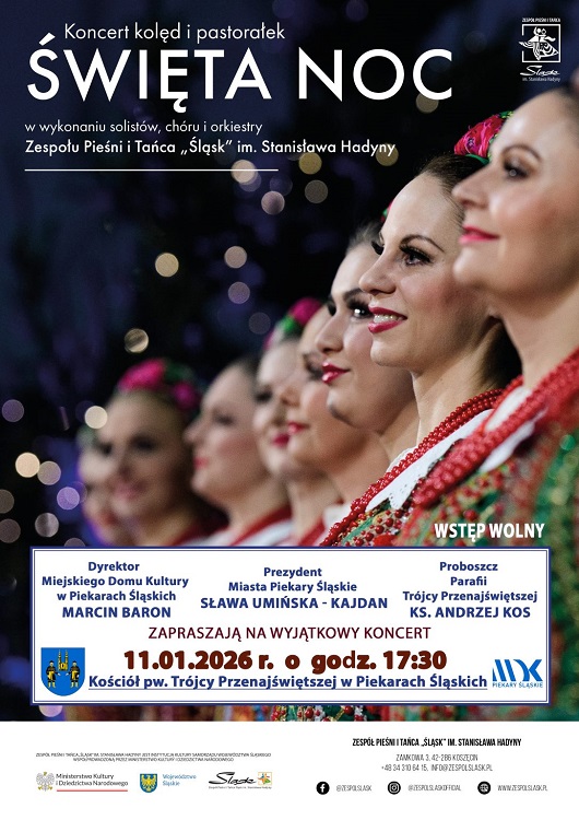Koncert najpiękniejszych kolęd i pastorałek w wykonaniu Zespołu Pieśni i Tańca „Śląsk” to wyjątkowa okazja, by poczuć magię świąt. Artyści chóru i orkiestry zaprezentują tradycyjne utwory, tworząc niezapomnianą atmosferę. Koncert organizowany przez Prezydent Miasta Piekary Śląskie, Proboszcza Parafii Trójcy Przenajświętszej oraz Dyrektora Miejskiego Domu Kultury.